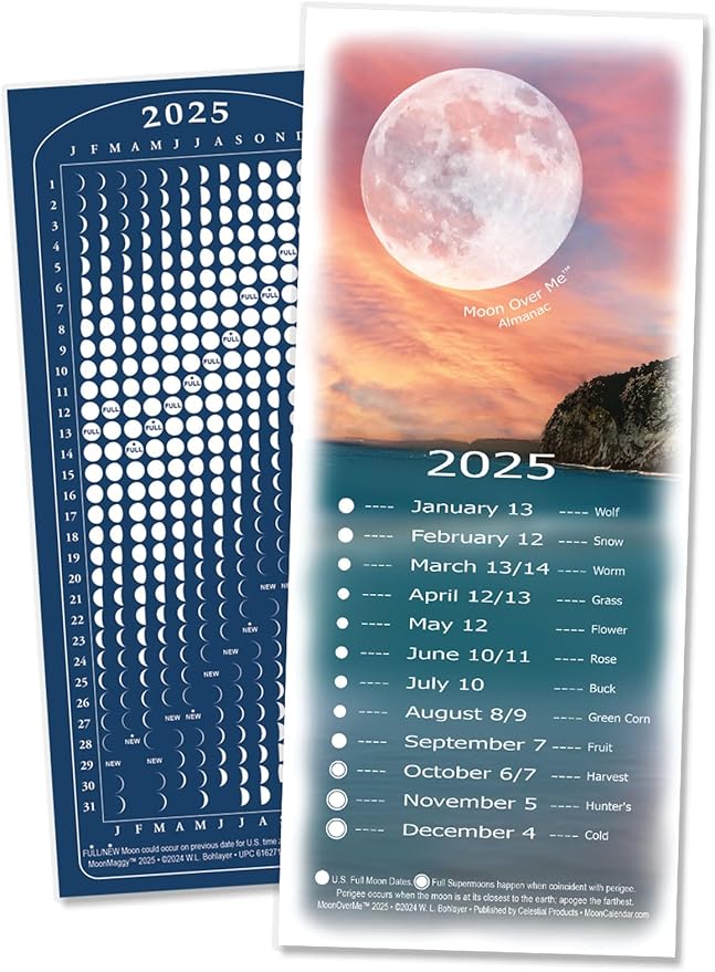 MoonMaggy: Moon calendar 2025- lunar phases 2025. It’s a magnetic calendar that is designed to stick to more than your fridge – put one on your boat, locker, tackle box, or any other steel surface. Or use it as a bookmark reference. Wherever you put it, MoonMaggy will keep you in step with the moon. Shows each day’s phase of the moon. Printed on thin magnetic base material with water resistant top coat. Includes our Moon Over Me card on which is printed ANOTHER moon calendar of daily moon phases. Card is slightly larger and contains four panels of information on date/times of major moon phases, eclipses, apogee/perigee, full moon names, etc. Sized to fit into a standard #10 envelope (not included) for mailing with your letter or greeting card.